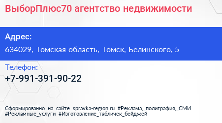 ВыборПлюс70, агентство недвижимости по адресу 634029, Томская область, Томск, Белинского, 5 в дальнейшем Организация, размещена в следующих категориях: