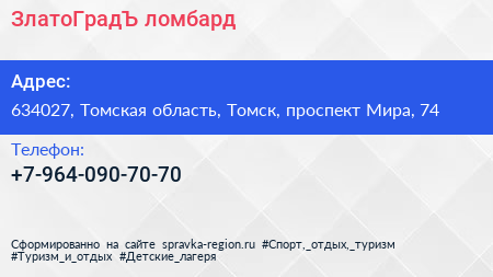 ЗлатоГрадЪ, ломбард по адресу 634027, Томская область, Томск, проспект Мира, 74 в дальнейшем Организация, размещена в следующих категориях: