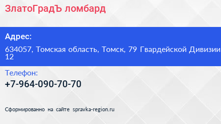 ЗлатоГрадЪ, ломбард по адресу 634057, Томская область, Томск, 79 Гвардейской Дивизии, 12 в дальнейшем Организация, размещена в следующих категориях: