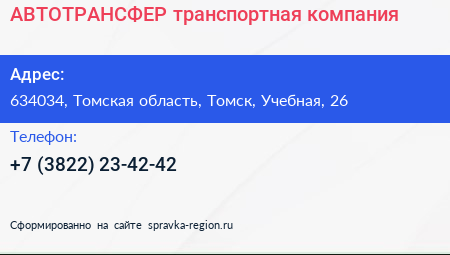 АВТОТРАНСФЕР, транспортная компания по адресу 634034, Томская область, Томск, Учебная, 26 в дальнейшем Организация, размещена в следующих категориях: