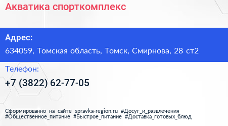 Акватика, спорткомплекс по адресу 634059, Томская область, Томск, Смирнова, 28 ст2 в дальнейшем Организация, размещена в следующих категориях: