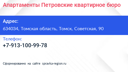 Апартаменты Петровские, квартирное бюро по адресу 634034, Томская область, Томск, Советская, 90 в дальнейшем Организация, размещена в следующих категориях: