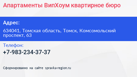 Апартаменты ВипХоум, квартирное бюро по адресу 634041, Томская область, Томск, Комсомольский проспект, 63 в дальнейшем Организация, размещена в следующих категориях: