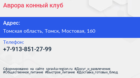 Аврора, конный клуб по адресу Томская область, Томск, Мостовая, 160 в дальнейшем Организация, размещена в следующих категориях: