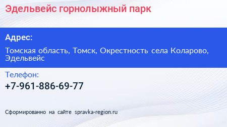 Эдельвейс, горнолыжный парк по адресу Томская область, Томск, Окрестность села Коларово, Эдельвейс в дальнейшем Организация, размещена в следующих категориях:
