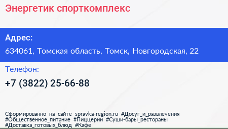 Энергетик, спорткомплекс по адресу 634061, Томская область, Томск, Новгородская, 22 в дальнейшем Организация, размещена в следующих категориях: