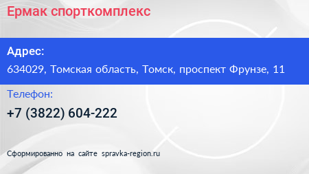 Ермак, спорткомплекс по адресу 634029, Томская область, Томск, проспект Фрунзе, 11 в дальнейшем Организация, размещена в следующих категориях:
