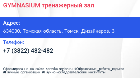 GYMNASIUM, тренажерный зал по адресу 634030, Томская область, Томск, Дизайнеров, 3 в дальнейшем Организация, размещена в следующих категориях: