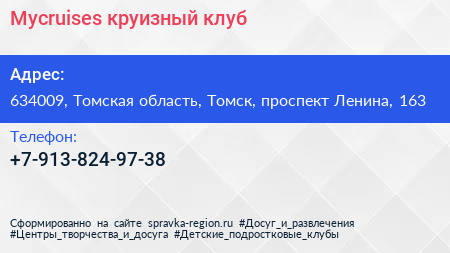 Mycruises, круизный клуб по адресу 634009, Томская область, Томск, проспект Ленина, 163 в дальнейшем Организация, размещена в следующих категориях: