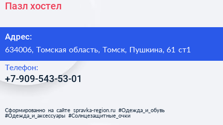Пазл, хостел по адресу 634006, Томская область, Томск, Пушкина, 61 ст1 в дальнейшем Организация, размещена в следующих категориях: