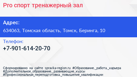 Pro-спорт, тренажерный зал по адресу 634063, Томская область, Томск, Беринга, 10 в дальнейшем Организация, размещена в следующих категориях: