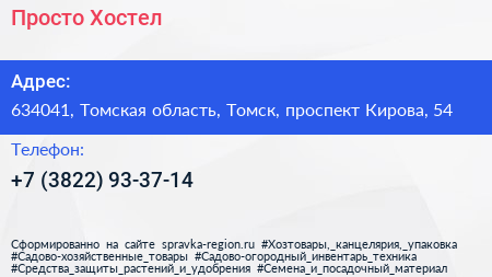 Просто Хостел по адресу 634041, Томская область, Томск, проспект Кирова, 54 в дальнейшем Организация, размещена в следующих категориях: