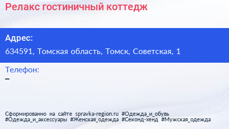 Релакс, гостиничный коттедж по адресу 634591, Томская область, Томск, Советская, 1 в дальнейшем Организация, размещена в следующих категориях: