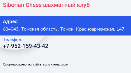 Siberian Chess, шахматный клуб по адресу 634045, Томская область, Томск, Красноармейская, 147 в дальнейшем Организация, размещена в следующих категориях: