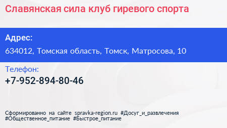 Славянская сила, клуб гиревого спорта по адресу 634012, Томская область, Томск, Матросова, 10 в дальнейшем Организация, размещена в следующих категориях: