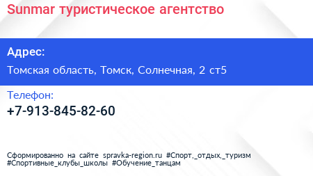 Sunmar, туристическое агентство по адресу Томская область, Томск, Солнечная, 2 ст5 в дальнейшем Организация, размещена в следующих категориях:
