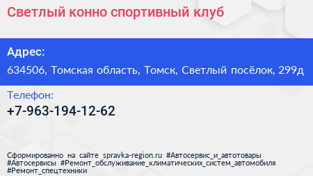 Светлый, конно-спортивный клуб по адресу 634506, Томская область, Томск, Светлый посёлок, 299д в дальнейшем Организация, размещена в следующих категориях: