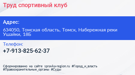 Труд, спортивный клуб по адресу 634050, Томская область, Томск, Набережная реки Ушайки, 18Б в дальнейшем Организация, размещена в следующих категориях: