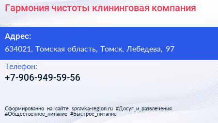 Гармония чистоты, клининговая компания по адресу 634021, Томская область, Томск, Лебедева, 97 в дальнейшем Организация, размещена в следующих категориях: