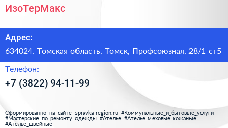 ИзоТерМакс по адресу 634024, Томская область, Томск, Профсоюзная, 28/1 ст5 в дальнейшем Организация, размещена в следующих категориях: