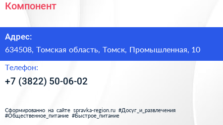 Компонент по адресу 634508, Томская область, Томск, Промышленная, 10 в дальнейшем Организация, размещена в следующих категориях: