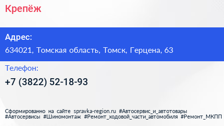 Крепёж по адресу 634021, Томская область, Томск, Герцена, 63 в дальнейшем Организация, размещена в следующих категориях: