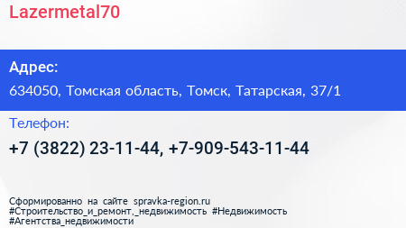 Lazermetal70 по адресу 634050, Томская область, Томск, Татарская, 37/1 в дальнейшем Организация, размещена в следующих категориях: