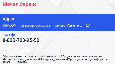 Мечел-Сервис по адресу 634059, Томская область, Томск, Ракетная, 17 в дальнейшем Организация, размещена в следующих категориях: