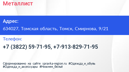 Металлист по адресу 634027, Томская область, Томск, Смирнова, 9/21 в дальнейшем Организация, размещена в следующих категориях: