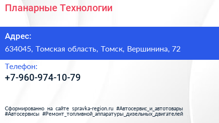 Планарные Технологии по адресу 634045, Томская область, Томск, Вершинина, 72 в дальнейшем Организация, размещена в следующих категориях: