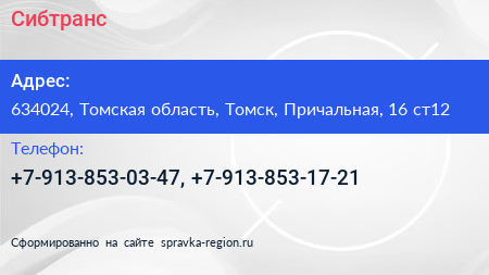 Сибтранс по адресу 634024, Томская область, Томск, Причальная, 16 ст12 в дальнейшем Организация, размещена в следующих категориях: