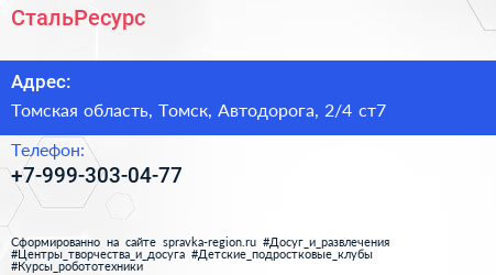 СтальРесурс по адресу Томская область, Томск, Автодорога, 2/4 ст7 в дальнейшем Организация, размещена в следующих категориях: