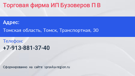 Торговая фирма, ИП Бузоверов П.В. по адресу Томская область, Томск, Транспортная, 30 в дальнейшем Организация, размещена в следующих категориях: