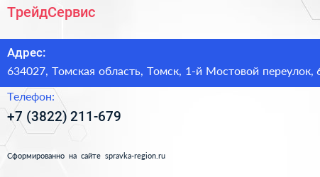 ТрейдСервис по адресу 634027, Томская область, Томск, 1-й Мостовой переулок, 6 в дальнейшем Организация, размещена в следующих категориях: