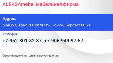 ALEKSAmebel, мебельная фирма по адресу 634063, Томская область, Томск, Берёзовая, 2а в дальнейшем Организация, размещена в следующих категориях:
