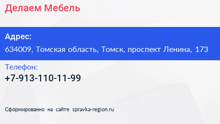 Делаем Мебель по адресу 634009, Томская область, Томск, проспект Ленина, 173 в дальнейшем Организация, размещена в следующих категориях:
