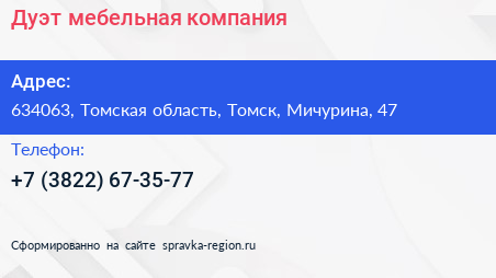 Дуэт, мебельная компания по адресу 634063, Томская область, Томск, Мичурина, 47 в дальнейшем Организация, размещена в следующих категориях: