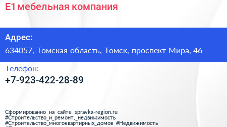 Е1, мебельная компания по адресу 634057, Томская область, Томск, проспект Мира, 46 в дальнейшем Организация, размещена в следующих категориях: