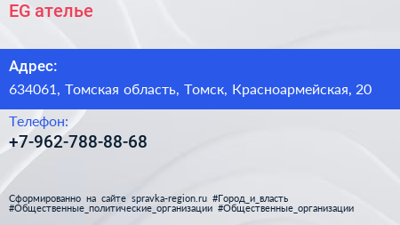 EG, ателье по адресу 634061, Томская область, Томск, Красноармейская, 20 в дальнейшем Организация, размещена в следующих категориях: