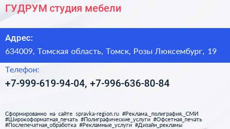 ГУДРУМ, студия мебели по адресу 634009, Томская область, Томск, Розы Люксембург, 19 в дальнейшем Организация, размещена в следующих категориях: