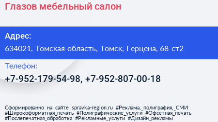 Глазов, мебельный салон по адресу 634021, Томская область, Томск, Герцена, 68 ст2 в дальнейшем Организация, размещена в следующих категориях: