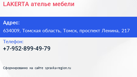 LAKERTA, ателье мебели по адресу 634009, Томская область, Томск, проспект Ленина, 217 в дальнейшем Организация, размещена в следующих категориях: