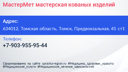 МастерМет, мастерская кованых изделий по адресу 634012, Томская область, Томск, Предвокзальная, 45 ст1 в дальнейшем Организация, размещена в следующих категориях: