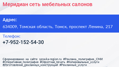 Меридиан, сеть мебельных салонов по адресу 634009, Томская область, Томск, проспект Ленина, 217 в дальнейшем Организация, размещена в следующих категориях: