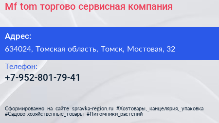 Mf.tom, торгово-сервисная компания по адресу 634024, Томская область, Томск, Мостовая, 32 в дальнейшем Организация, размещена в следующих категориях: