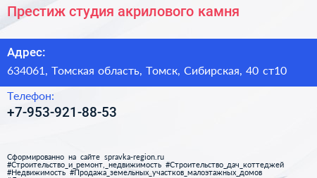 Престиж, студия акрилового камня по адресу 634061, Томская область, Томск, Сибирская, 40 ст10 в дальнейшем Организация, размещена в следующих категориях:
