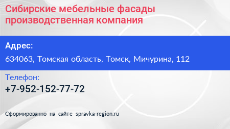 Сибирские мебельные фасады, производственная компания по адресу 634063, Томская область, Томск, Мичурина, 112 в дальнейшем Организация, размещена в следующих категориях: