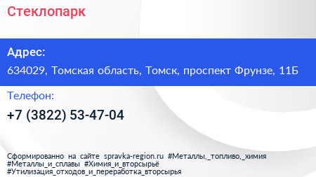 Стеклопарк по адресу 634029, Томская область, Томск, проспект Фрунзе, 11Б в дальнейшем Организация, размещена в следующих категориях: