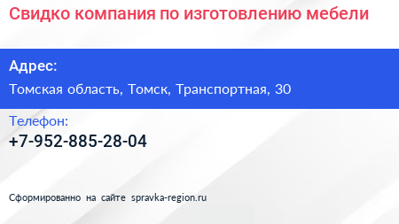 Свидко, компания по изготовлению мебели по адресу Томская область, Томск, Транспортная, 30 в дальнейшем Организация, размещена в следующих категориях: