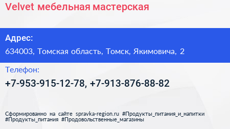 Velvet, мебельная мастерская по адресу 634003, Томская область, Томск, Якимовича, 2 в дальнейшем Организация, размещена в следующих категориях: